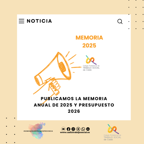 El Colegio Profesional de Trabajo Social de Cádiz ha publicado su Memoria de Actividades correspondiente a 2025, que incluye el Presupuesto para 2026, tras su aprobación en la Asamblea General Ordinaria celebrada el pasado 4 de marzo.