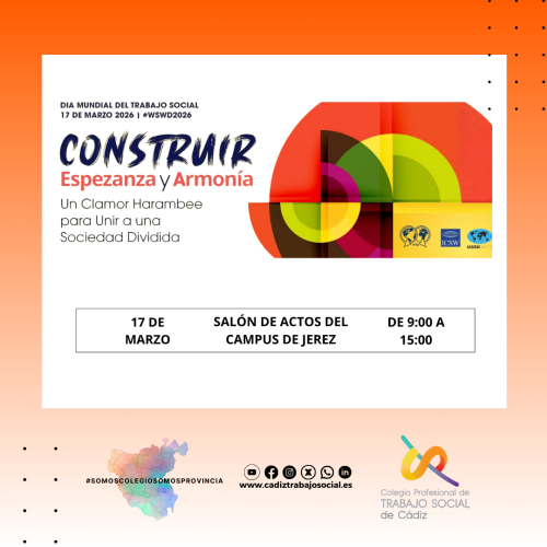 El Colegio Profesional de Trabajo Social de Cádiz, en colaboración con la Universidad de Cádiz, celebrará el próximo 17 de marzo el Día Mundial del Trabajo Social con una jornada profesional que tendrá lugar en el Salón de Actos del Campus de Jerez, en horario de 9:00 a 15:00 horas. ¡Guárdate la fecha para celebrar con nosotras!