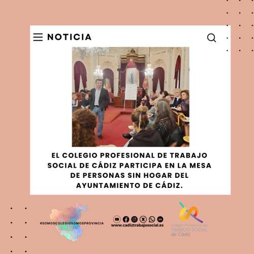 El Colegio Profesional de Trabajo Social de Cádiz ha participado en la Mesa de Personas Sin Hogar del Ayuntamiento de Cádiz, un espacio de carácter participativo que se articula como un foro de encuentro para dar voz a las personas sin hogar, así como a los colectivos, entidades y asociaciones que trabajan en este ámbito, con el objetivo de desarrollar un trabajo conjunto orientado a la mejora de sus condiciones de vida.