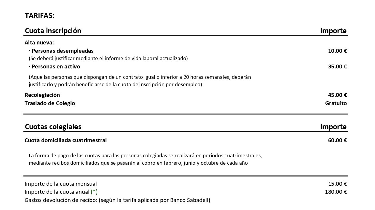 (*) Las nuevas tarifas fueron aprobadas en la Asamblea General celebrada en marzo de 2025 y entraron en vigor a partir del 1 de julio de 2025