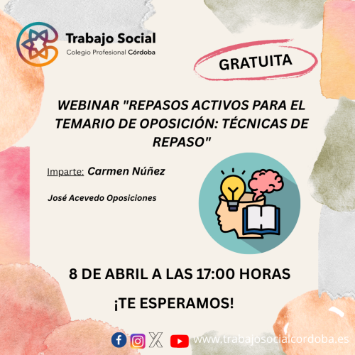 Por si resulta de tu interés, te informamos sobre la webinar gratuita “Repasos activos para el temario de oposición: Técnicas de repaso”, impartida por Carmen Núñez, de José Acevedo Oposiciones.