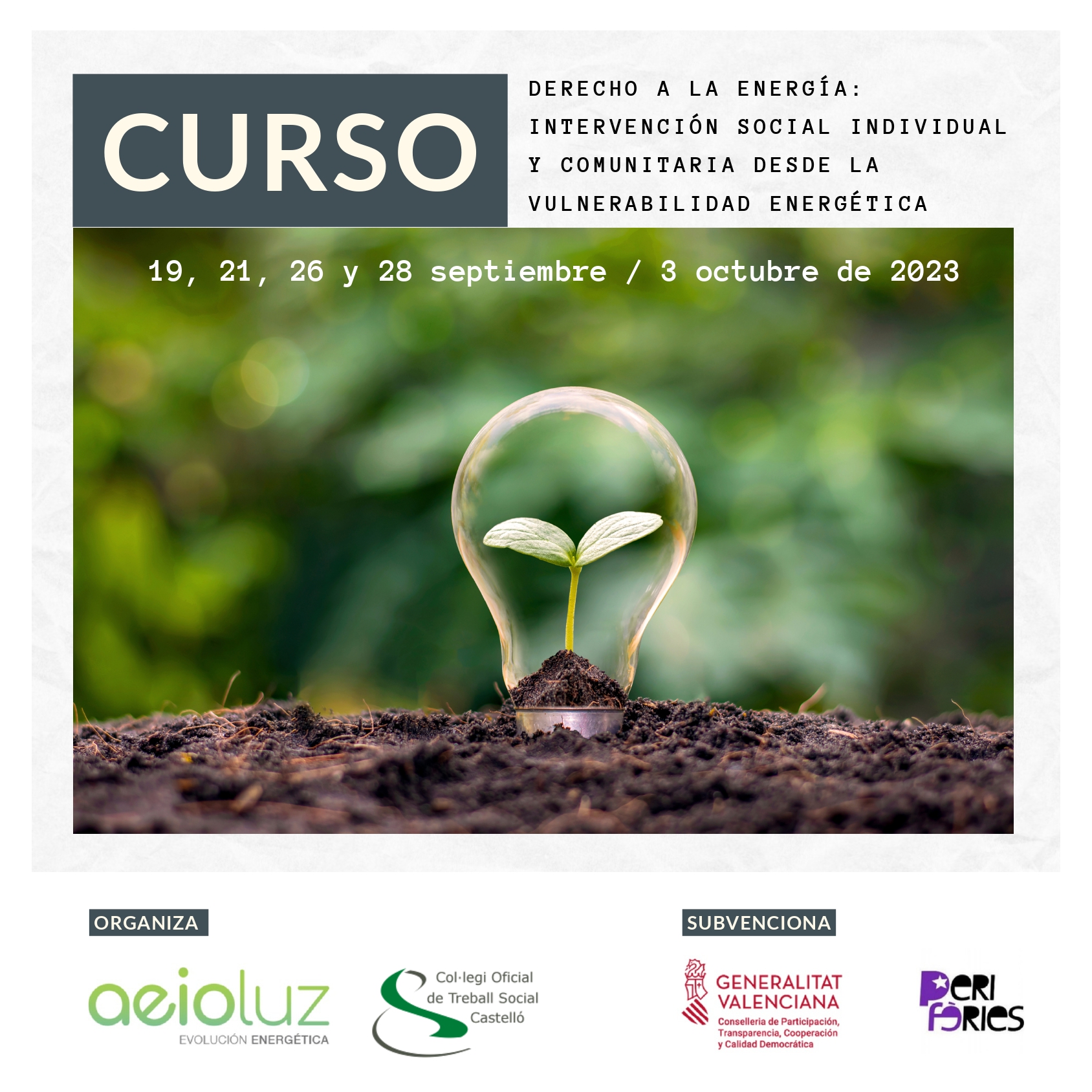 La formación, organizada por COTS Castelló y la cooperativa valenciana Aeilouz (especializada en el diseño de planes energéticos promotores de mejoras y cambios y facilitadores del empoderamiento energético) es gratuita. Cuenta con la subvención de la Conselleria de Participacion, Transparencia, Cooperacion y Calidad Democrática y de la coordinadora valenciana de ONGD Perifèries.