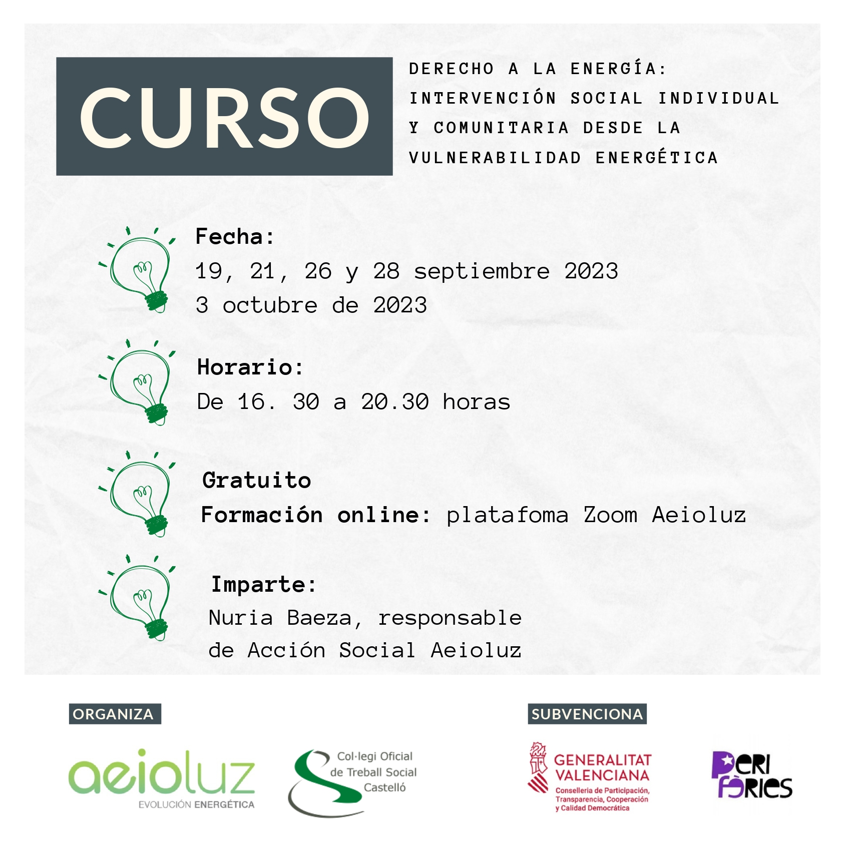 Estos son algunos de los muchos objetivos que se marca la formación ‘Derecho a la Energía: Intervención social individual y comunitaria desde la vulnerabilidad energética’. Un curso de vertiente práctica – irá acompañado por material didáctico y una guía de intervención social en vulnerabilidad energética – que se impartirá en cinco sesiones (19, 21, 26 y 28 de septiembre y 3 de octubre de 2023), de 16.30 a 20.30 horas en formato online y 20 horas de duración.