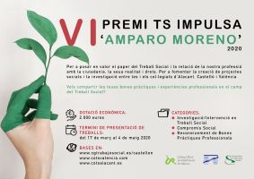 Castelló, 12/03/2020.- Els Col·legis Professionals de Treball Social de Castelló, València i Alacant convoquen la sisena edició del Premi TS Impulsa ‘Amparo Moreno’ 2020. Un guardó que té com a repte posar en valor el paper del Treball Social i la relació de la professió amb la ciutadania, la seua realitat i els seus drets, així com fomentar la creació de projectes socials i la investigació entre les i els col·legiats de les tres províncies de la Comunitat Valenciana.