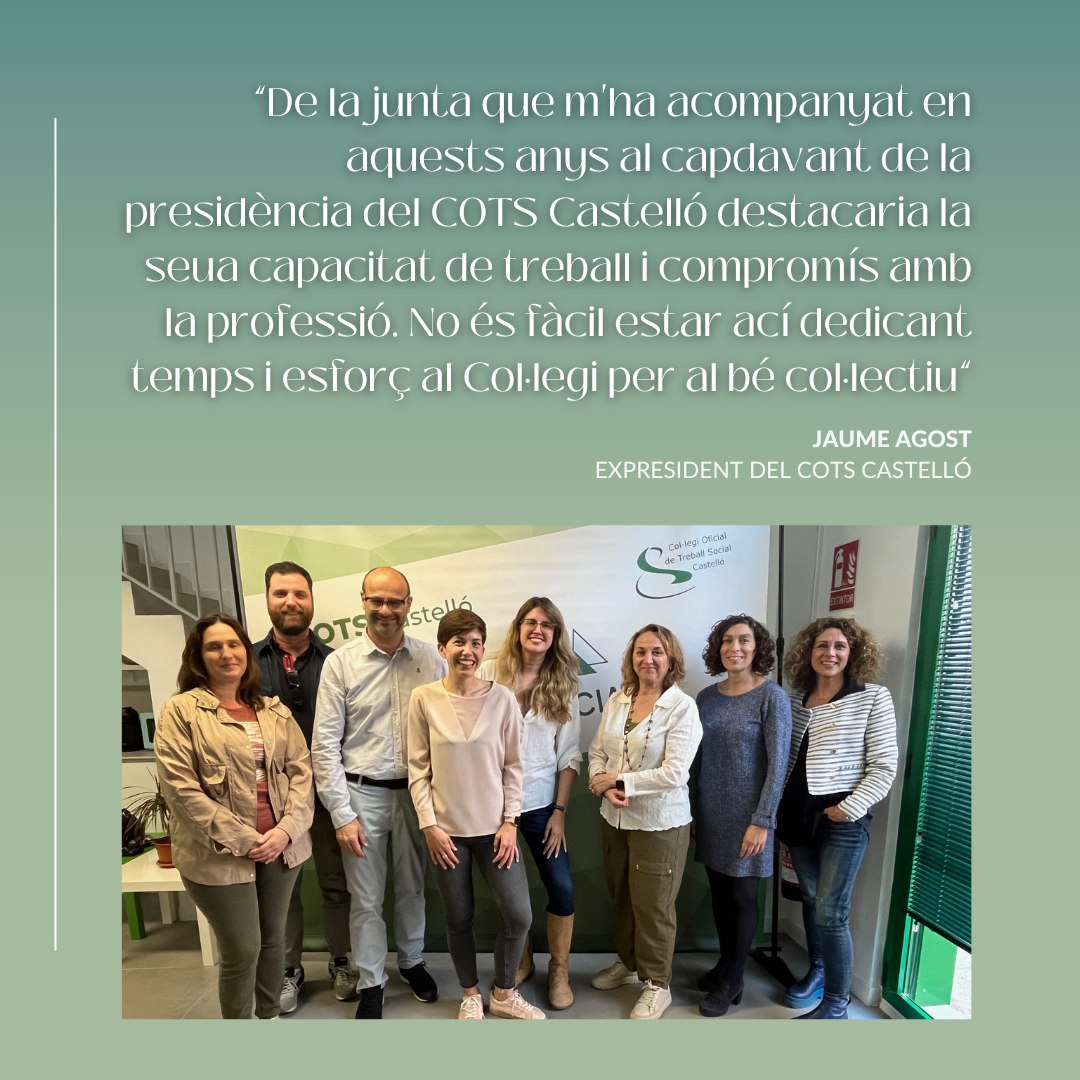 Castelló, 30/04/2024.- El Col·legi Oficial de Treball Social de Castelló acaba de proclamar a la seua nova junta de govern, que presidirà María José Pérez. Amb aquest relleu encara recent, Jaume Agost, president del Col·legi durant dos mandats consecutius – de 2016 a 2024 – fa balanç del treball realitzat en els seus vuit anys de govern i els reptes pendents. En aquest temps “el COTS Castelló, i la professió, han guanyat visibilitat i especialització en tots els àmbits on és present”, diu. Reconeix també que hi ha nous objectius en l’horitzó. Constituir oficialment el Consell Valencià de Treball Social – les bases del qual va asseure fa dues setmanes el Pacte de Benicàssim – per a reforçar la representativitat davant l’administració, és un dels més immediats. També incorporar a l’UJI el Grau en Treball Social i la figura de les i els treballadors socials a l’àrea d’emergències.