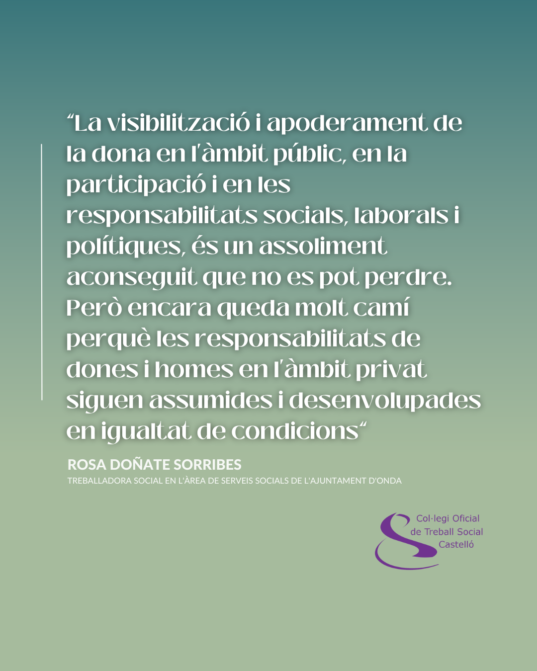 La visibilització i apoderament de la dona en l’àmbit públic, en la participació i en les responsabilitats socials, laborals i polítiques, és un assoliment aconseguit que no es pot perdre. Però encara queda molt camí perquè les responsabilitats de dones i homes en l’àmbit privat siguen assumides i desenvolupades en igualtat de condicions.