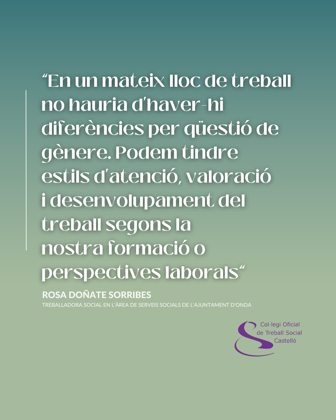 - La col·legiada i treballadorasocial Rosa Doñate advoca en aquesta entrevista amb motiu del Dia Internacionalde la Dona per promoure la incorporació dels professionals homes “sobretot enl’àmbit de l’atenció directa a les persones i en la gestió dels ServeisSocials”