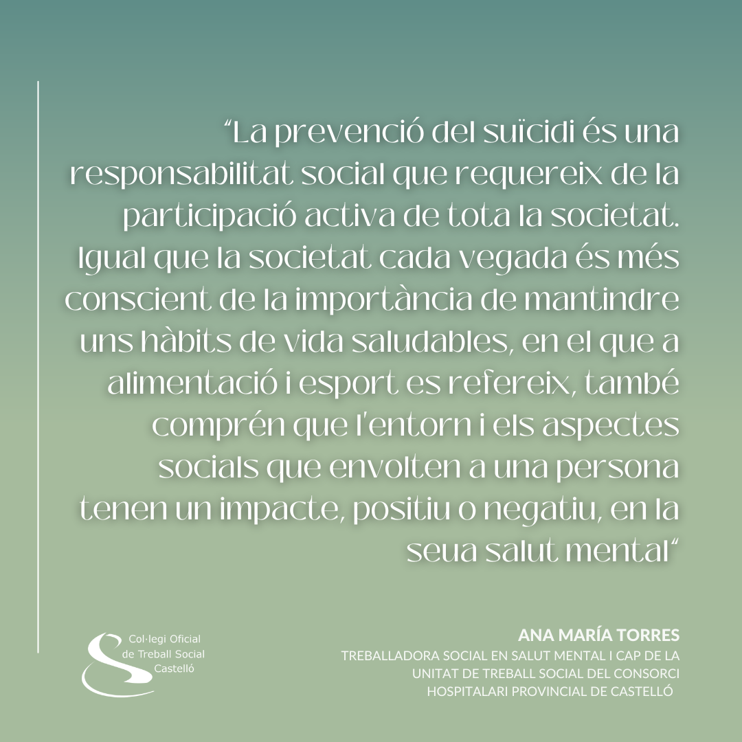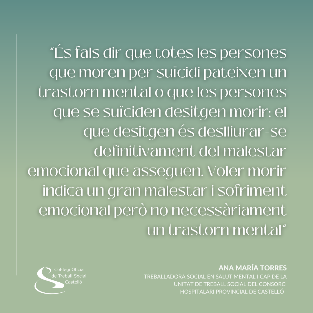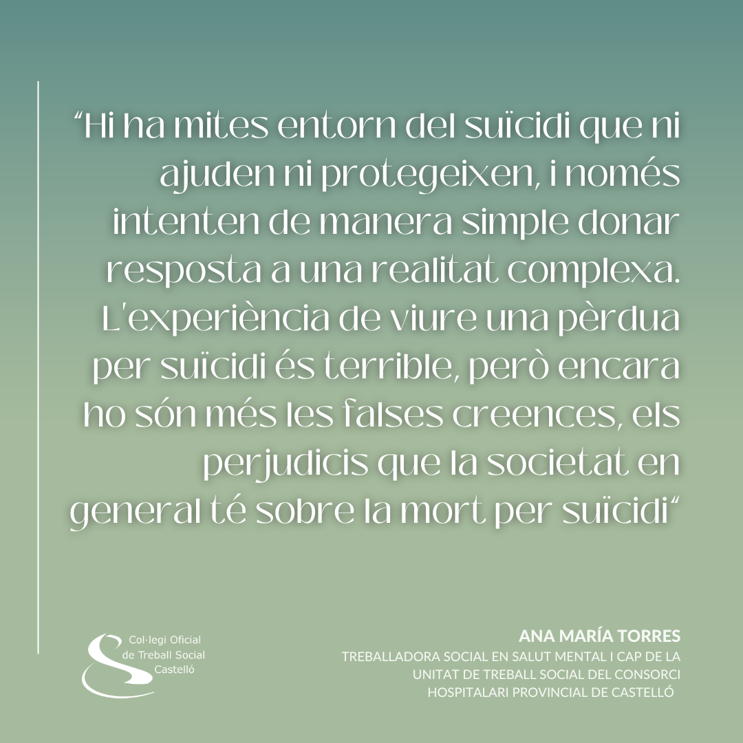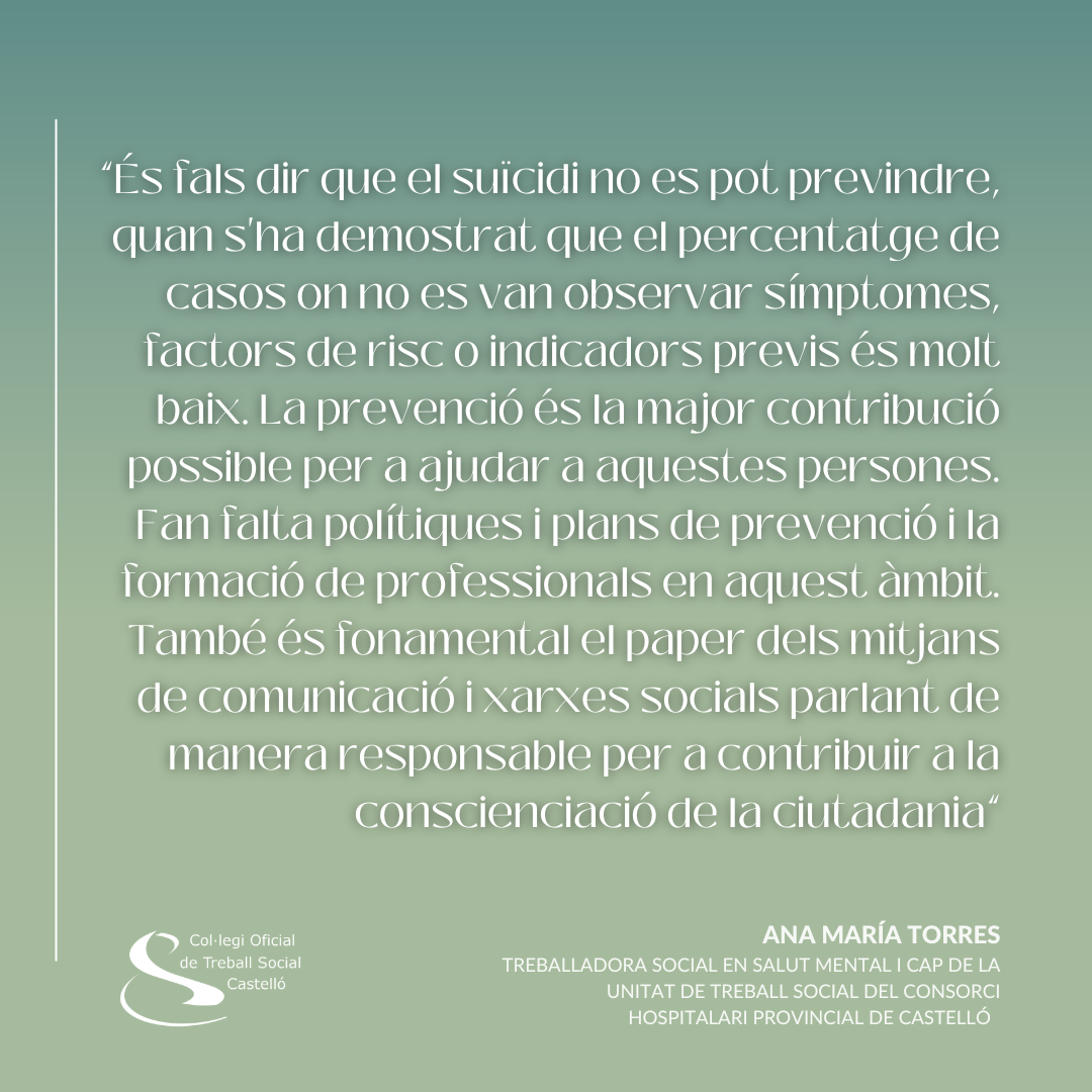 ENTREVISTA A ANA MARIA TORRES, TREBALLADORA SOCIAL EN SALUT MENTAL: “El suïcidi és freqüent i devastador; moltes vegades no es pot predir, però sí previndre; la seua prevenció és una responsabilitat social”