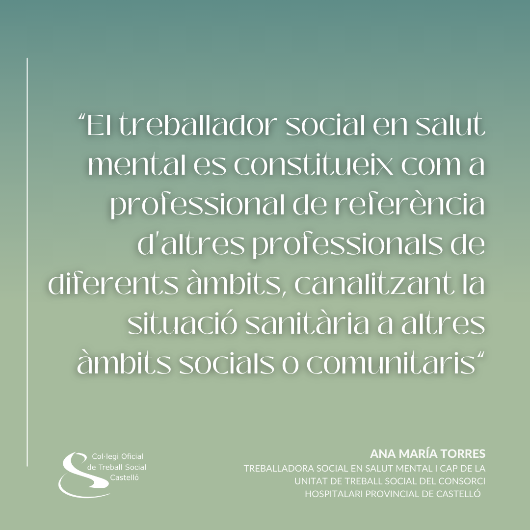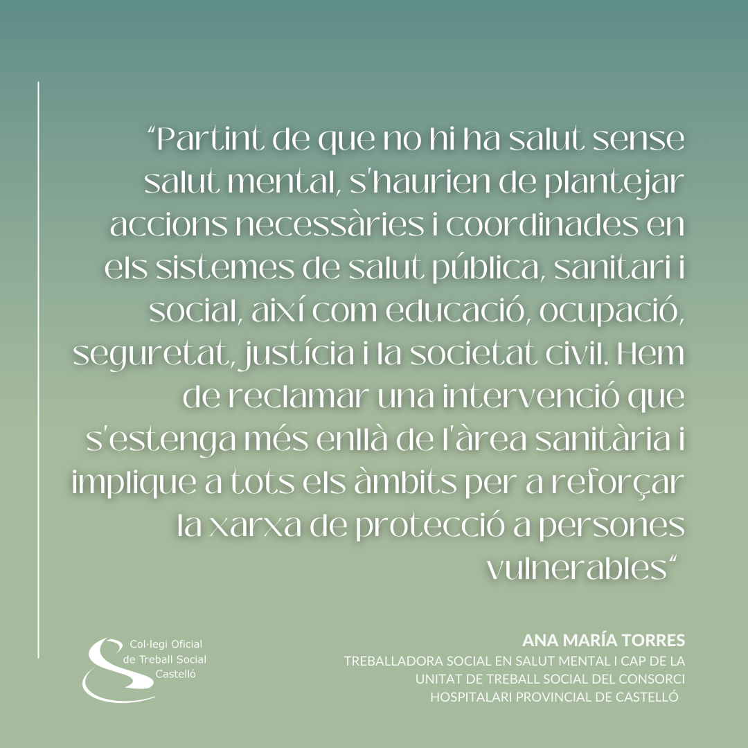 La treballadora social Ana María Torres, cap de la Unitat de Treball Social del Consorci Hospitalari Provincial de Castelló, reclama una intervenció que s’estenga més enllà de l’àrea sanitària per a reforçar la xarxa de protecció a persones vulnerables. Defensa el paper del TS en la detecció precoç de factors de risc, la proporció de suport emocional i la promoció de xarxes de seguretat i l’accés a recursos terapèutics.