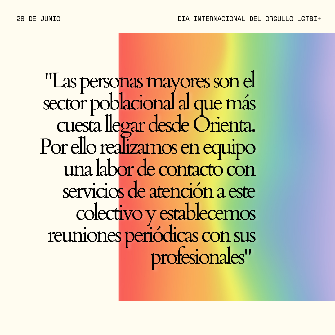 R.- Las personas mayores son el sector poblacional al que más cuesta llegar desde Orienta. Por ello realizamos en equipo una labor de contacto con servicios de atención a personas mayores y establecemos reuniones periódicas con los profesionales. Una de las realidades y preocupaciones más dolorosas del colectivo LGTBI es la soledad en la vejez. En el periodo histórico anterior en el que vivían, estaban regidas bajo la ‘ley de vagos y maleantes y de peligrosidad criminal’, cuyo texto contemplaba una serie de reproches jurídicos por la orientación sexual del colectivo LGTBI. Expresarte como una persona LGTBI en la calle podía hacer que te encarcelasen. Esta realidad ha influenciado en el desarrollo de la vida y en la psicología de estas personas, obligadas a permanecer en el armario durante años. Por ello muchas de ellas se veían abocadas a la soledad, en el caso de poder librarse del matrimonio.
