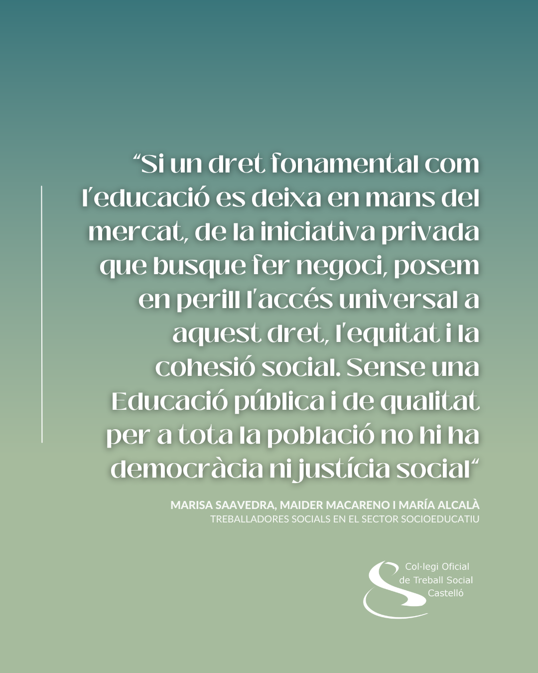 A més, com ocorre amb altres drets fonamentals (el dret a la salut, per exemple) són les administracions les que han d’assegurar l’accés de tota la població a una educació de qualitat i compensadora de les desigualtats socials. Si no és així, l’Educació, i la resta de drets, es converteixen en un privilegi només a l’abast dels qui tenen més recursos econòmics i tindrem un sistema educatiu segregador i que perpetuarà les desigualtats. Les concepcions privatitzadores i de negoci en aquest i altres àmbits posen en perill l’accés a drets i la mateixa cohesió social.