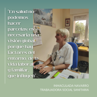 Un campo amplio que requiere de una visión global – que incluya ese velar por el bienestar físico, emocional y social que dicta la OMS – y en el que el Trabajo Social tiene mucho que aportar, y que decir. En salud, incide Inmaculada Navarro, no se pueden “hacer parcelas”, porque “hay factores del entorno, de la vida laboral y familiar, que influyen en ese proceso de ausencia de salud, por lo que es muy importante estudiar y valorar todos los factores para poder hacer un diagnóstico en el que tienen que intervenir todos los profesionales” desde una perspectiva “interdisciplinar”.
