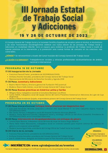 COTS Castelló col·labora en aquest encontre estatal de Treball Social i Addiccions organitzat pel Consell General del Treball Social, que es celebrarà els dies 19 i 26 d’octubre