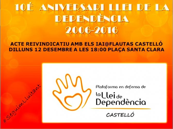 El dia 12 de desembre, a les 18h, a la plaça Santa Clara es celebrarà una concentració organitzada per la Plataforma en defensa de la Llei de Dependència junt als Iai@flautes, amb motiu del 10º aniversari de la Llei de la Dependència.