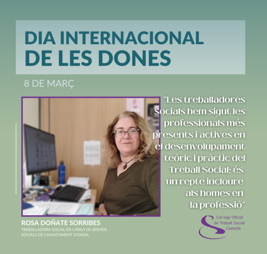 - La col·legiada i treballadorasocial Rosa Doñate advoca en aquesta entrevista amb motiu del Dia Internacionalde la Dona per promoure la incorporació dels professionals homes “sobretot enl’àmbit de l’atenció directa a les persones i en la gestió dels ServeisSocials”