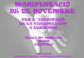 El divendres, 25 de novembre, Dia Internacional contra la violència cap a les dones es realitzarà una manifestació a Castelló que començarà a la plaça Mª Agustina, amb la lectura final del manifest per part de les organitzacions associatives de la Plataforma de la Igualtat de Castelló i Esther Jovani, Dona de l’any 2016, i companya nostra.