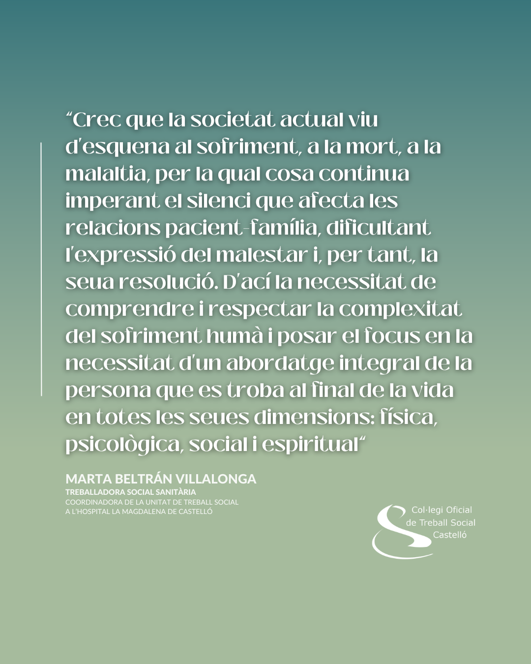 R.- Crec que la societat actual viu d’esquena al sofriment, a la mort, a la malaltia, per la qual cosa continua imperant el silenci que afecta les relacions pacient-família, dificultant l’expressió del malestar i, per tant, la seua resolució. D’ací la necessitat de comprendre i respectar la complexitat del sofriment humà i posar el focus en la necessitat d’un abordatge integral de la persona que es troba al final de la vida en totes les seues dimensions: física, psicològica, social i espiritual.