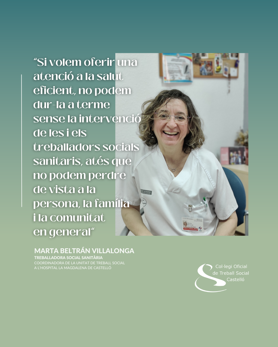 Castelló, 07/04/2025.- Reconéixer el Treball Social Sanitari (TSS) com a professió imprescindible en els equips de salut. Reivindicar la visibilitat dels seus professionals, la labor dels quals és clau per a garantir el dret a la salut – entesa com a complet benestar físic, mental i social – de totes les persones. Analitzar la intervenció del Treball Social en un camp encara desconegut com són les cures pal·liatives… De tot això parlem des de COTS Castelló, en aquesta entrevista amb motiu del Dia Mundial de la Salut, amb la nostra companya Marta Beltrán. Treballadora social a l’Hospital La Magdalena de Castelló, on coordina la Unitat de Treball Social, forma part de l’equip de professionals que treballa en Cures Pal·liatives, Medicina Interna per a convalescència i llarga estada, i les Consultes Externes de la Unitat de Neurologia de la Conducta i Demències (la unitat de referència de la província).