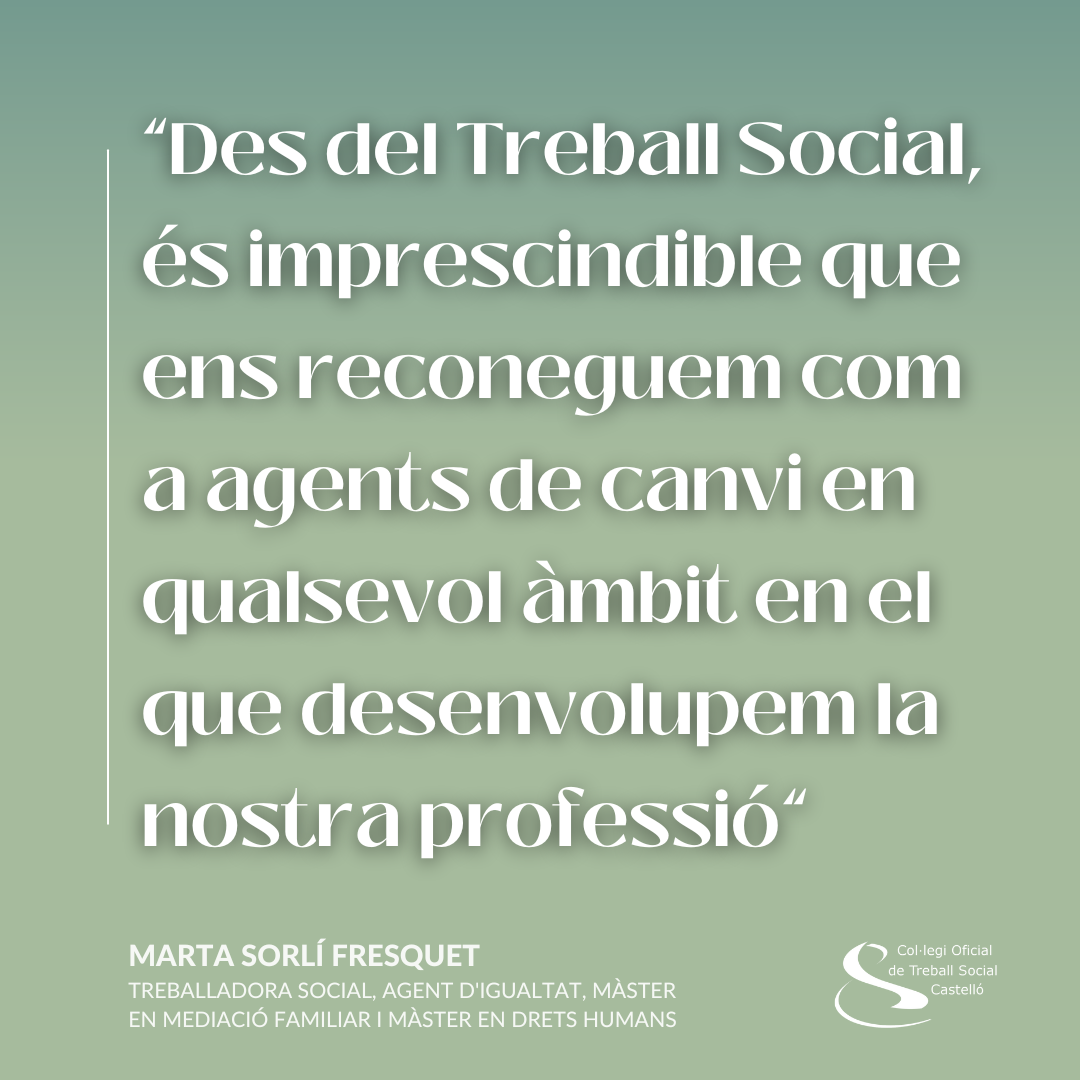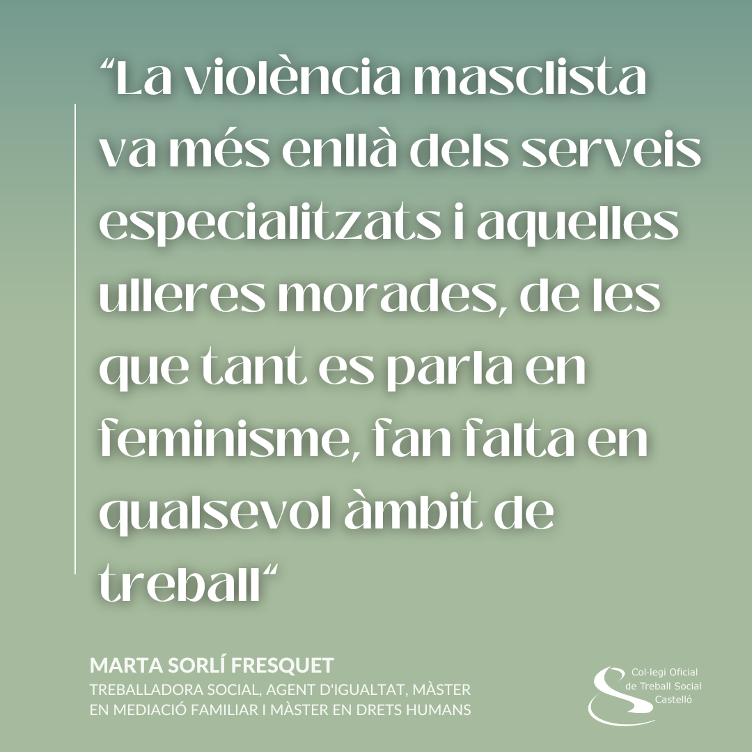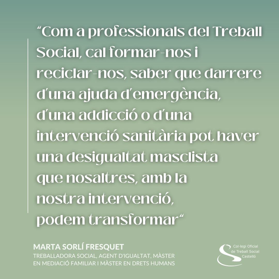 Amb motiu del 25N, la nostra companya Marta Sorlí Fresquet, treballadora social i agent d’igualtat, comparteix aquesta reflexió sobre el paper del Treball Social, i de les seues i els seus professionals, en la lluita contra la violència de gènere