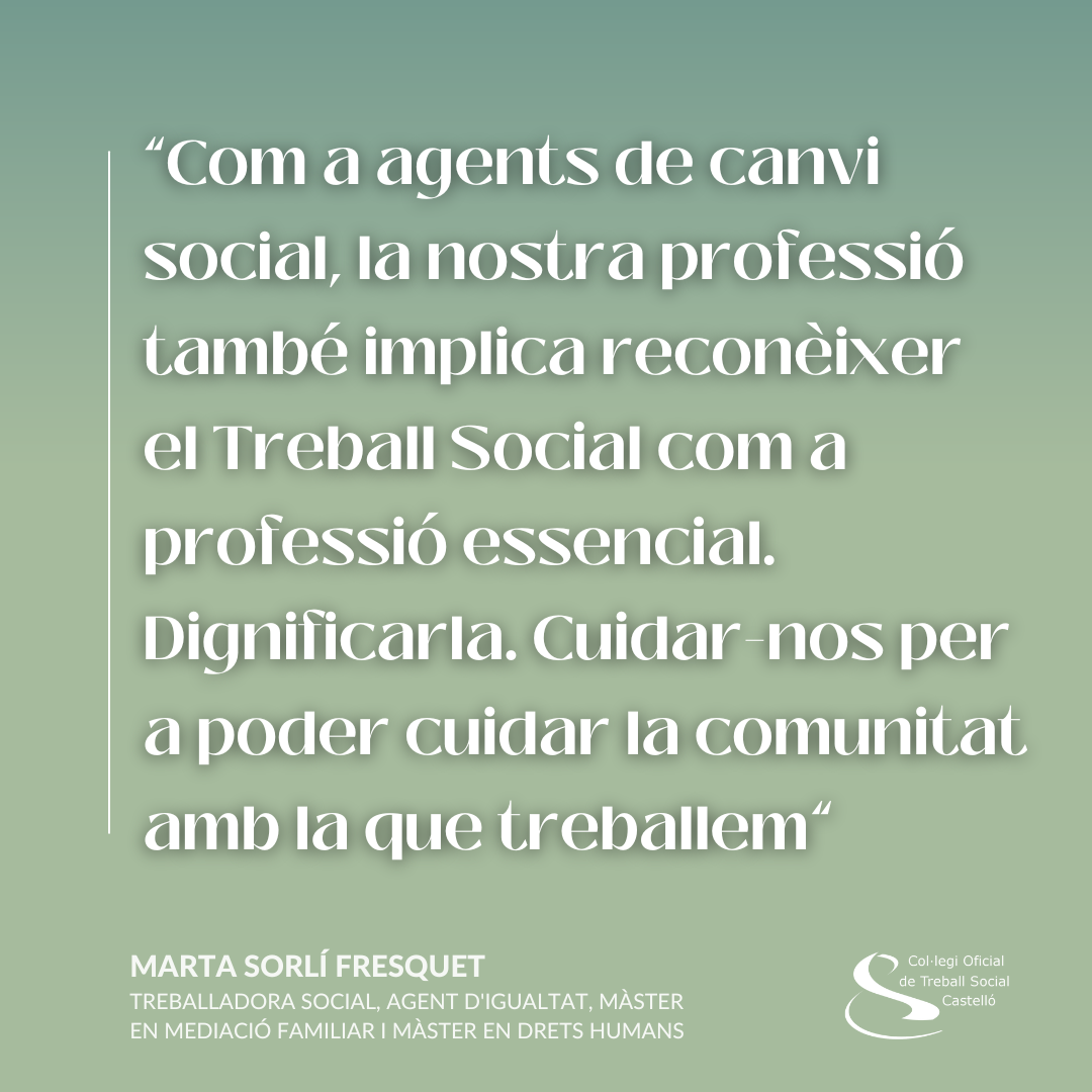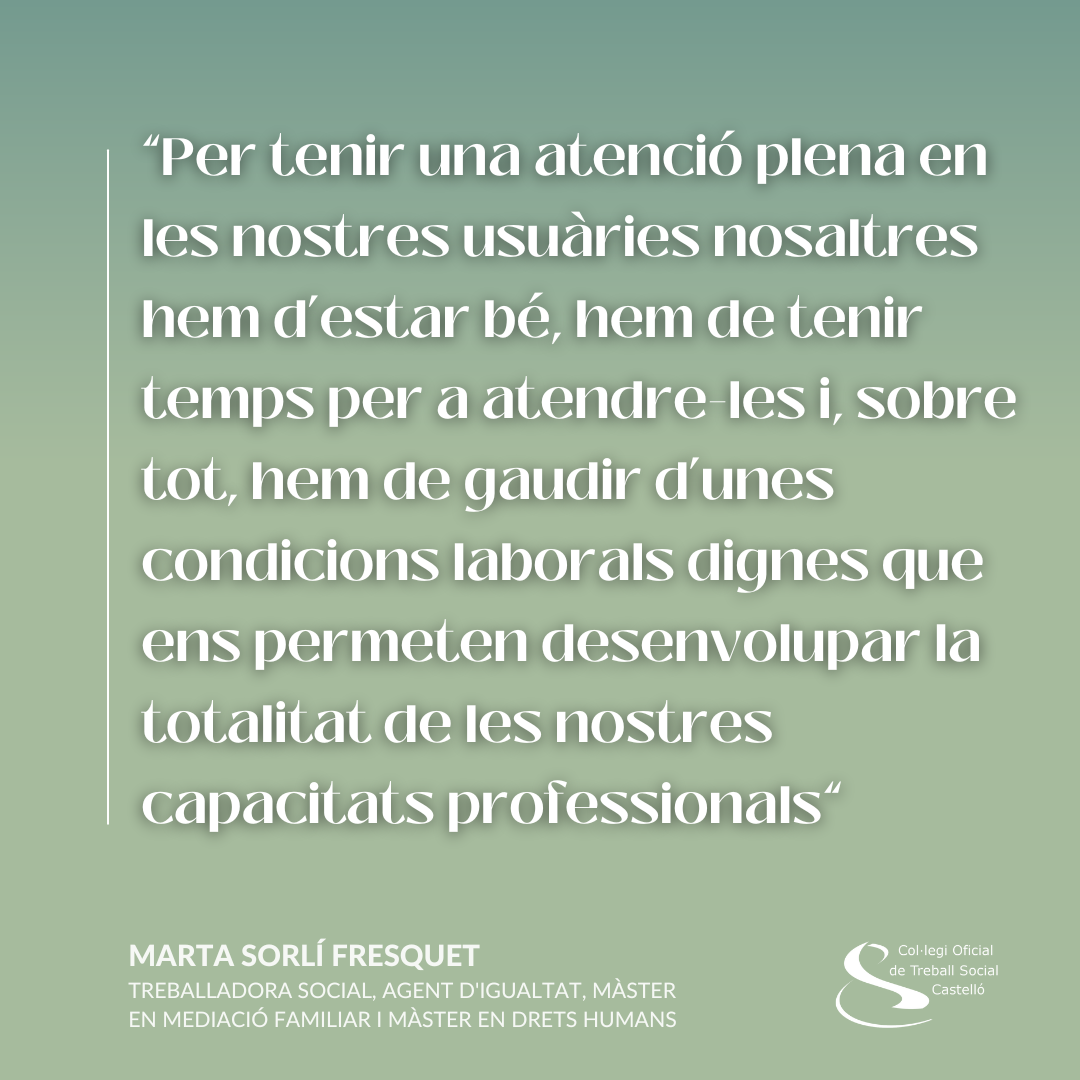 Però, sobre totes les coses, ens cal dignificar la nostra professió reivindicant els serveis públics i cuidant els espais de formació i reciclatge professional. Com a agents de canvi social, la nostra professió també implica reconèixer el treball social com a professió essencial i, per tant, garantir els espais de qualitat. Perquè per tenir una atenció plena en les nostres usuàries nosaltres hem d estar bé, hem de tenir temps per a atendre-les i, sobre tot, hem de gaudir d unes condicions laborals dignes que ens permeten desenvolupar la totalitat de les nostres capacitats professionals. Cuidar-nos per a poder cuidar la comunitat amb la que treballem.
