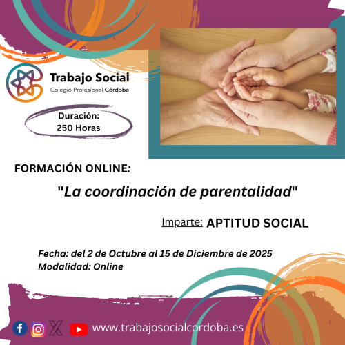 Horariodel jueves 02 de Octubre al lunes 15 de Diciembre de 2025Te informamos sobre el nuevo Curso online “Curso La Coordinación de Parentalidad”, organizado por nuestro Colegio Profesional e impartido por APTITUD SOCIAL