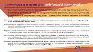 El Consejo Andaluz de Colegios Profesionales de Trabajo Social ha remitido un nuevo escrito a la Consejería de Igualdad Igualdad, Políticas Sociales y Conciliación en Defensa del Sistema Público de SSSS esta vez relacionado con los Presupuestos2022 de la Junta de Andalucía.