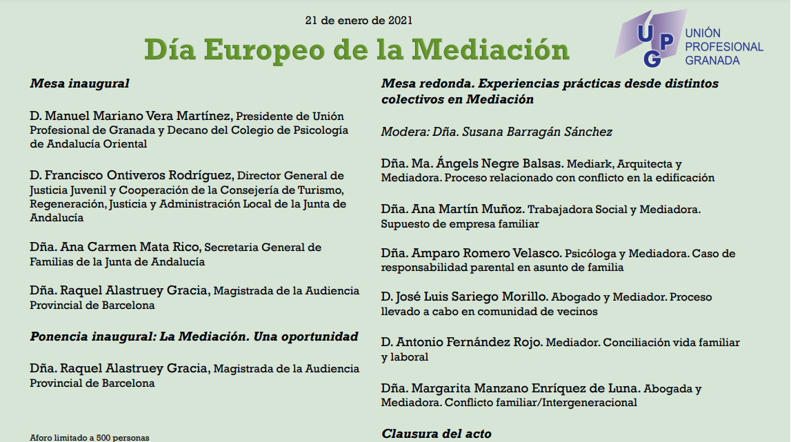 Desde el Colegio Oficial de Trabajo Social de Granada y como miembros activos de Unión Profesional de Granada, nos gustaría invitaros al acto virtual que Unión Profesional de Granada celebra con motivo del día Europeo de la Mediación el próximo 21 de enero de 2021 a las 17:00 horas.