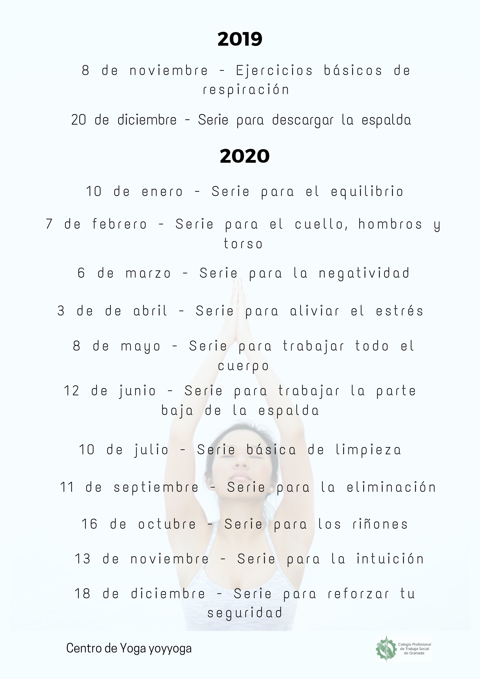 Todas las sesiones están programadas en viernes, y el horario es de 18.00h a 19.30h por sesión. Se impartirán en el Centro de Yoga yoyyoga de Granada.