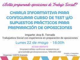 Debido a la demanda continua acerca de formación específica para preparación de oposiciones, sea a nivel teórico como práctico (en concreto para la convocatoria de oposiciones al cuerpo de funcionarios de la Junta de Andalucía para plazas de trabajo social), desde el Colegio Profesional de Trabajo Social de Granada hemos organizado una Charla Informativa y de sondeo acerca de las necesidades concretas que tengan aquellas personas que estén interesadas en realizar un curso para formar en la parte práctica de oposiciones (realización de test y supuestos), aplicable no sólo a ésta convocatoria que hemos mencionado, si no a cualquiera que se les pudiera presentar.