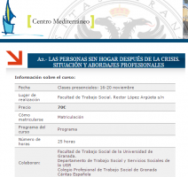El Departamento de Trabajo Social y Servicios Sociales ofrece ocho (8) medias becas destinadas a trabajadores/as sociales colegiados/as, en situación de desempleo para financiar la mitad de la cuota de inscripción del curso “LAS PERSONAS SIN HOGAR TRAS LA CRISIS. SITUACIÓN ACTUAL Y ABORDAJES PROFESIONALES” Que organiza el Centro Mediterráneo de la Universidad de Granada del 16 al 19 de noviembre de 2015.