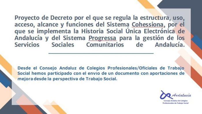 Desde el Colegio Oficial de Trabajo Social Granada, os informamos que el Consejo Andaluz de Trabajo Social, ha presentado aportaciones al Proyecto de Decreto por el que se regula la estructura, uso, acceso, alcance y funciones del Sistema COHESSIONA, por el que se implementa la historia Social Única Electrónica de Andalucía y del Sistema PROGRESSA para la gestión de los Servicios Sociales Comunitarios de Andalucía.