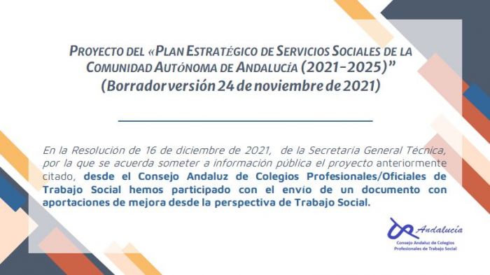 El Consejo Andaluz de Trabajo Social ha hecho entrega de las aportaciones presentadas por todos los colegios andaluces al Plan Estratégico de Servicios Sociales de Andalucía. El documento podrá consultarse en el Colegio.