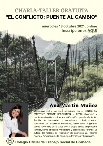 El próximo miércoles 13 de octubre de 2021 a las 17.00h tendrá lugar la charla-taller que ofrece al Colegio, la compañera colegiada Ana Martín Muñoz sobre resolución de conflictos “El conflicto: Puente al cambio” vía online y dirigida gratuitamente a todas las personas interesadas en la mediación y la resolución de conflictos.