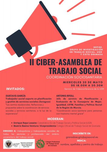 El próximo Miércoles 20 de mayo tendrá lugar la II CiberAsamblea de Trabajo Social de Granada con la temática de Coordinación Sociosanitaria.