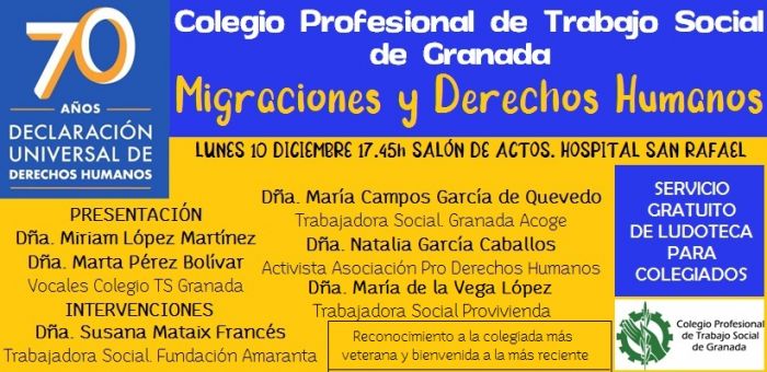 Es para la Junta de Gobierno del Colegio Profesional de Trabajo Social de Granada, un placer invitaros al acto que tendrá lugar con motivo de la Celebración del 70 ANIVERSARIO DE LA DECLARACIÓN UNIVERSAL DE LOS DERECHOS HUMANOS.