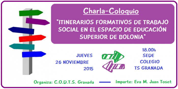 La charla “Itinerarios Formativos de Trabajo Social en el espacio de Educación Superior de Bolonia” tendrá lugar el próximo día 26 de noviembre de 2015 a las 18.00h, en la sede del Colegio de Granada. (C/Arabial nº68, edificio bolonia, bajo)