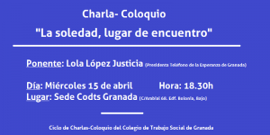 El próximo miércoles, día 15 de abril, a las 18.30 h., en la sede del Colegio de Trabajo Social de Granada (C/Arabial 68, edf bolonia, bajo), tendrá lugar la charla “La Soledad, lugar de encuentro”, que será impartida por la compañera Lola López Justicia, Presidenta del Teléfono de la Esperanza