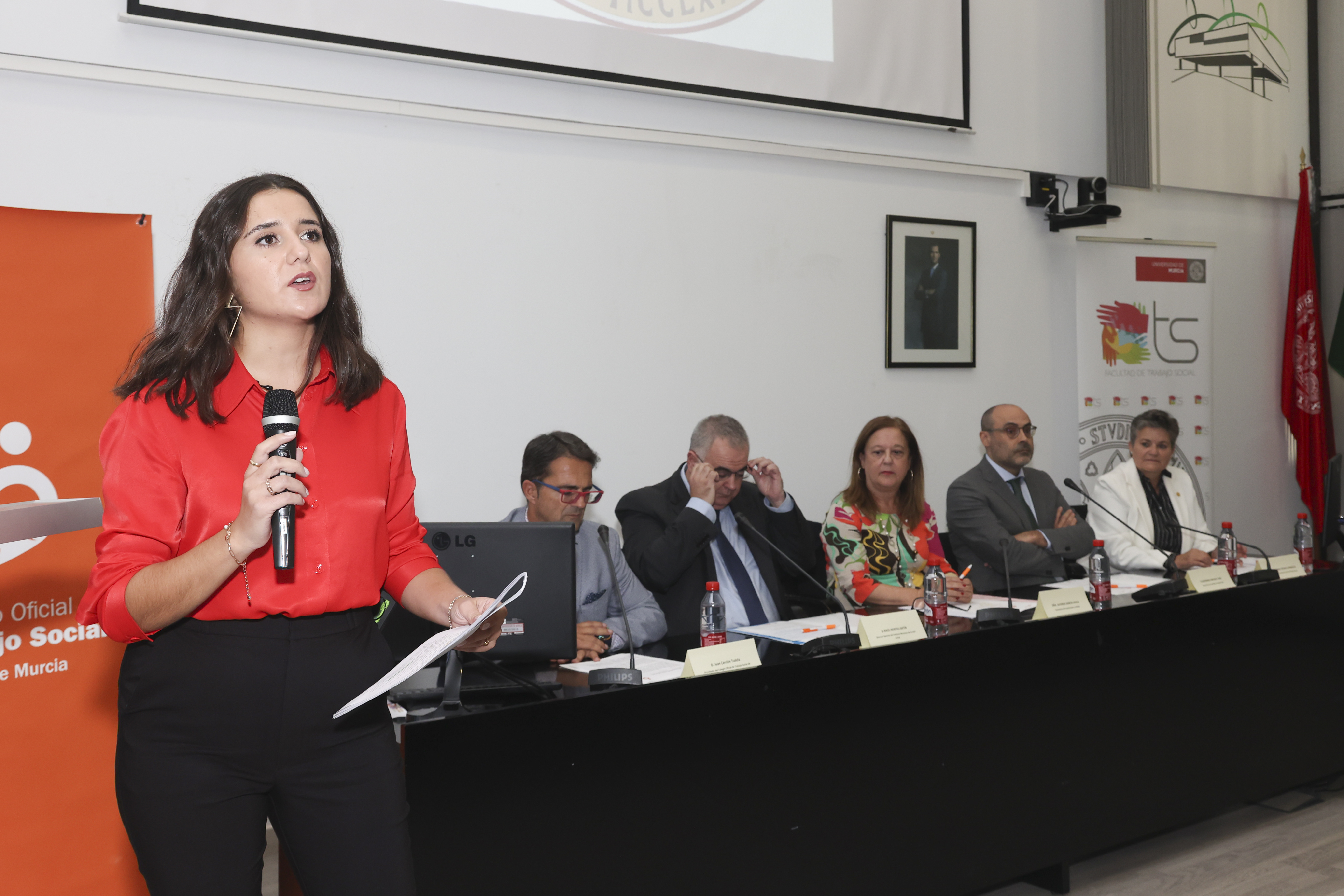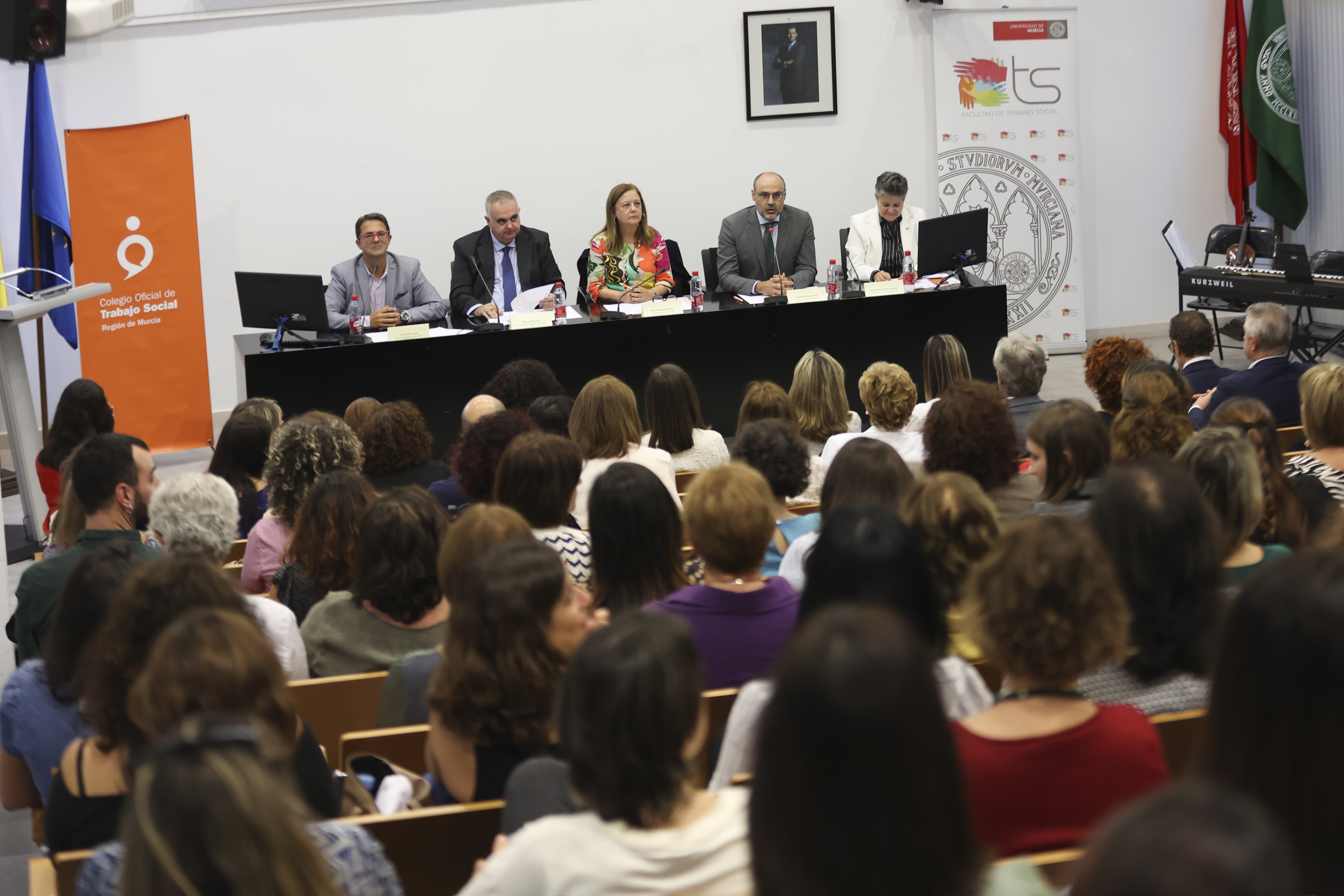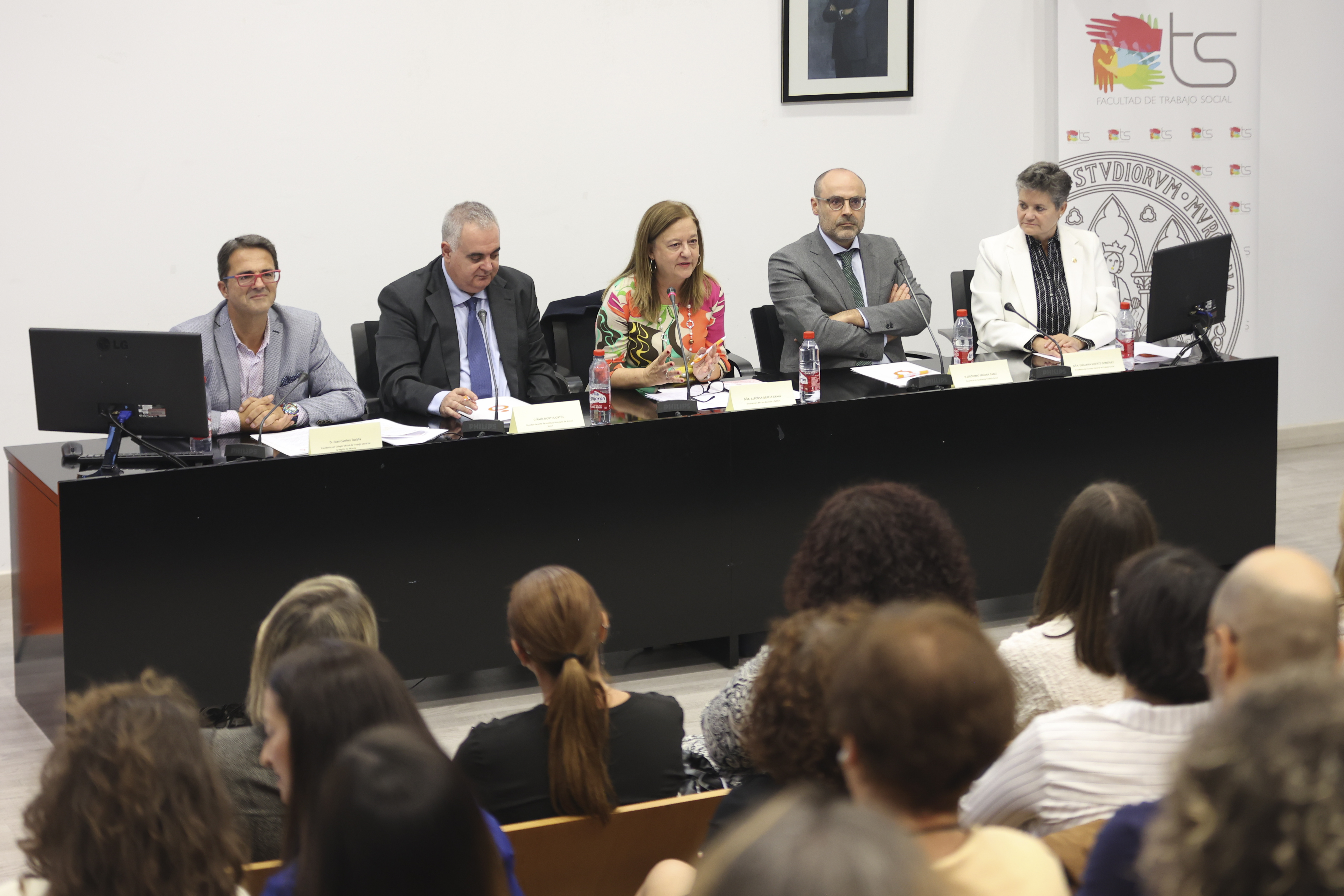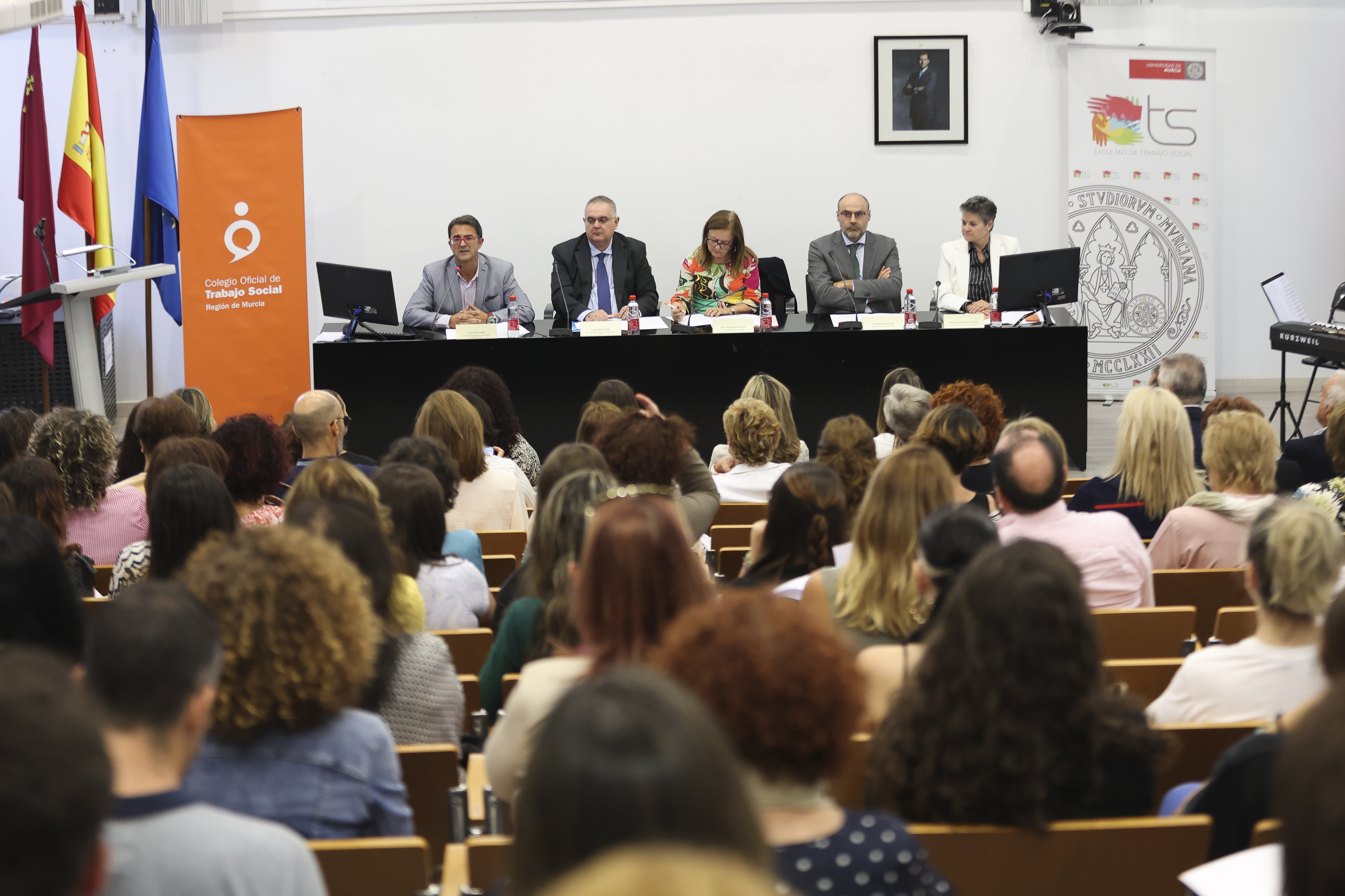 El acto ha estado presidido por la Exma. Sra. Dña. Alfonsa García Ayala, Vicerrectora de Coordinación y Calidad de la Universidad de Murcia, el Ilmo. Sr. D. Raúl Nortes Ortín, Director Gerente del Instituto Murciano de Acción Social (IMAS), D. Jerónimo Molina Cano, Decano de la Facultad de Trabajo Social, Dña. Emiliana Vicente González, Presidenta del Consejo General del Trabajo Social y D. Juan Carrión Tudela, Presidente del Colegio del Colegio de Trabajo Social.