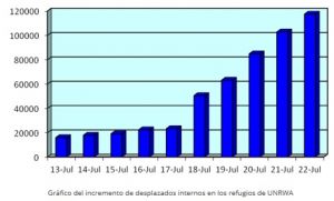 UNRWA ha estado proporcionando refugio a los desplazados por este conflicto desde el 12 de julio. Desde que comenzó la ofensiva terrestre israelí el 17 de julio, el número de desplazados internos en Gaza ha aumentado de forma espectacular, más del doble entre el 17 y 18 de julio y ha aumentado más de 10.000 personas cada 24 horas (hasta el 22 de julio). En este contexto, UNRWA elogia a su personal que trabaja sin descanso en los refugios para ayudar a miles de personas que lo necesitan, bajo una gran presión, mientras que ellos mismos siguen sufriendo las consecuencias del conflicto. Para las comunidades de Gaza que han vivido con tristeza varias escaladas de la violencia en los últimos años, las escuelas de la UNRWA se consideran bienes de la comunidad que proporcionan refugio en tiempos de conflicto. Es de vital importancia que el respeto por el DIH se mantenga y que los refugios de UNRWA puedan seguir proporcionando seguridad a la población civil desplazada.