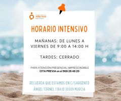 Os recordamos que el Colegio, según Convenio de Colegios Profesionales de la Región de Murcia, inicia su jornada intensiva a partir del 1 de junio hasta el 15 de septiembre de 2024.