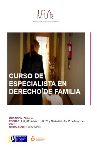El Colegio de Abogados de Murcia, a través de su Sección de Derecho de Familia, con la colaboración del Colegio de Psicólogos de la Región de Murcia, del Colegio de Trabajo Social de la Región de Murcia, así como de las Secciones de Derecho sanitario y Bioética, Derecho Civil y Derecho laboral de ICAMUR, ha organizado una ACCIÓN FORMATIVA DE ESPECIALIZACIÓN EN DERECHO DE FAMILIA , que se desarrollará en los próximos meses Marzo, Abril y Mayo, conforme a los bloques formativos y fechas que podéis leer con detenimiento en el programa general.