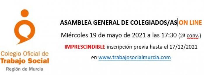 El Colegio Oficial de Trabajo Social de la Región de Murcia ha celebrado en fecha 19 de mayo de 2021 la Asamblea General Ordinaria en modalidad on line, en la que se aprobó de forma unánime el acta de la asamblea anterior y la memoria anual de 2020.