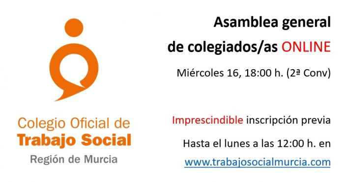Para prever la asistencia a la Asamblea General y garantizar las medidas necesarias para realizarla en la modalidad on line, es necesaria la inscripción de las/os colegiadas/os que deseen asistir en el siguiente enlace antes de las 12:00 hs del día 14/12/2020: