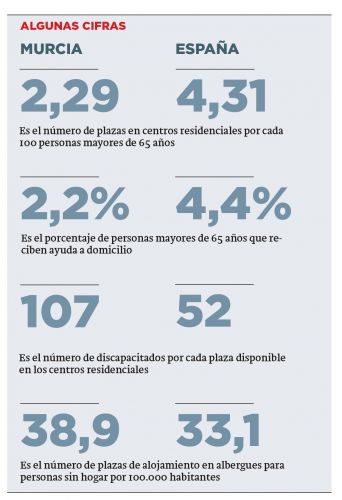 MURCIA. El Gobierno autonómico y los ayuntamientos redujeron entre 2011 y 2013 en casi 70 millones de euros el dinero destinado al mantenimiento del sistema de protección social en la Región, según un informe de la Asociación de Directores y Gerentes de Servicios Sociales publicado el pasado viernes. Si en 2011 las administraciones murcianas invirtieron 267,87 euros por habitante en políticas sociales (cerca de 394 millones en total), en 2013 la cifra se había reducido a 220,71 (324,8 millones). El recorte alcanza el 17,6%, y es cuatro puntos superior al que se produjo en el conjunto de España en este periodo.