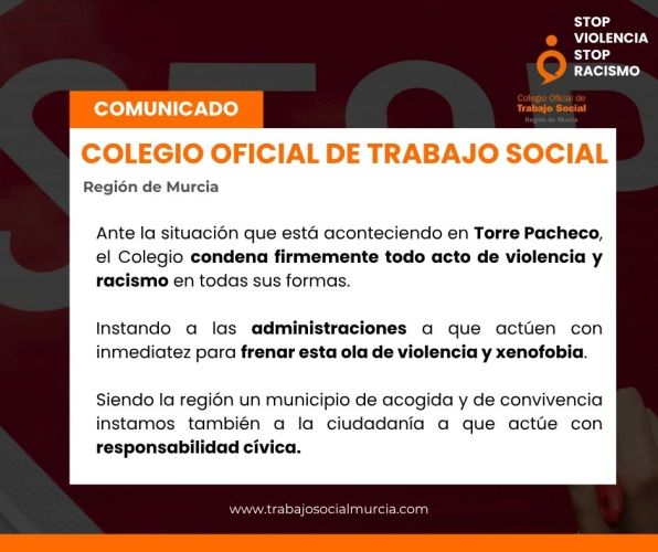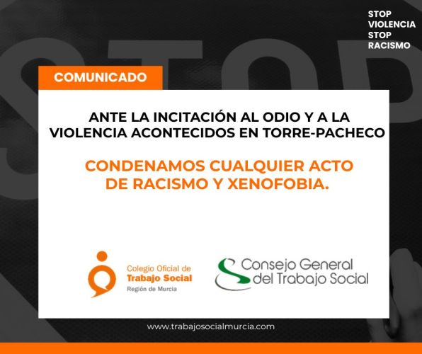 El Colegio y el CGTS ante la incitación al odio y a la violencia acontecidos en Torre-Pacheco condenan cualquier acto de racismo y xenofobia