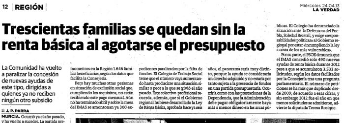 La Verdad: Trescientas familias se quedan sin la Renta Básica al agotarse el presupuesto