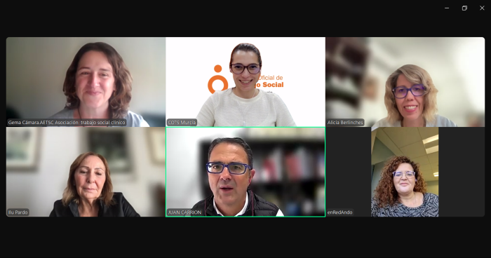 D. Juan Carrión Tudela, Presidente del Colegio e Iluminada Pardo Cayuela, Vicepresidenta del Colegio han mantenido una reunión online con la Asociación Española de Trabajo Social Clínico (AETSC) en la que se contó con la participación de Dña. Alicia Berlinches, Presidenta AETSC, Dña. Natalia Navarro Ruano, Secretaria AETSC y Dña. Gema Cámara, Tesorera AETSC.