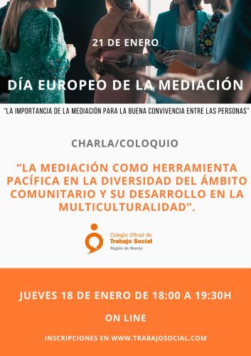 Información e inscripciones en el siguiente enlace: https://www.cgtrabajosocial.es/murcia/eventos/charla-coloquio-la-mediacion-como-herramienta-pacifica-en-la-diversidad-del-ambito-comunitario-y-su-desarrollo-en-la-multiculturalidad/2447/view