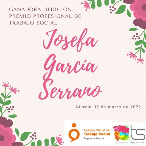 El Colegio de Trabajo Social de la Región de Murcia y la Facultad de Trabajo Social de la Universidad de Murcia, nos complace comunicar que la persona ganadora de la II Edición del Premio Profesional es Dña. Josefa García Serrano.