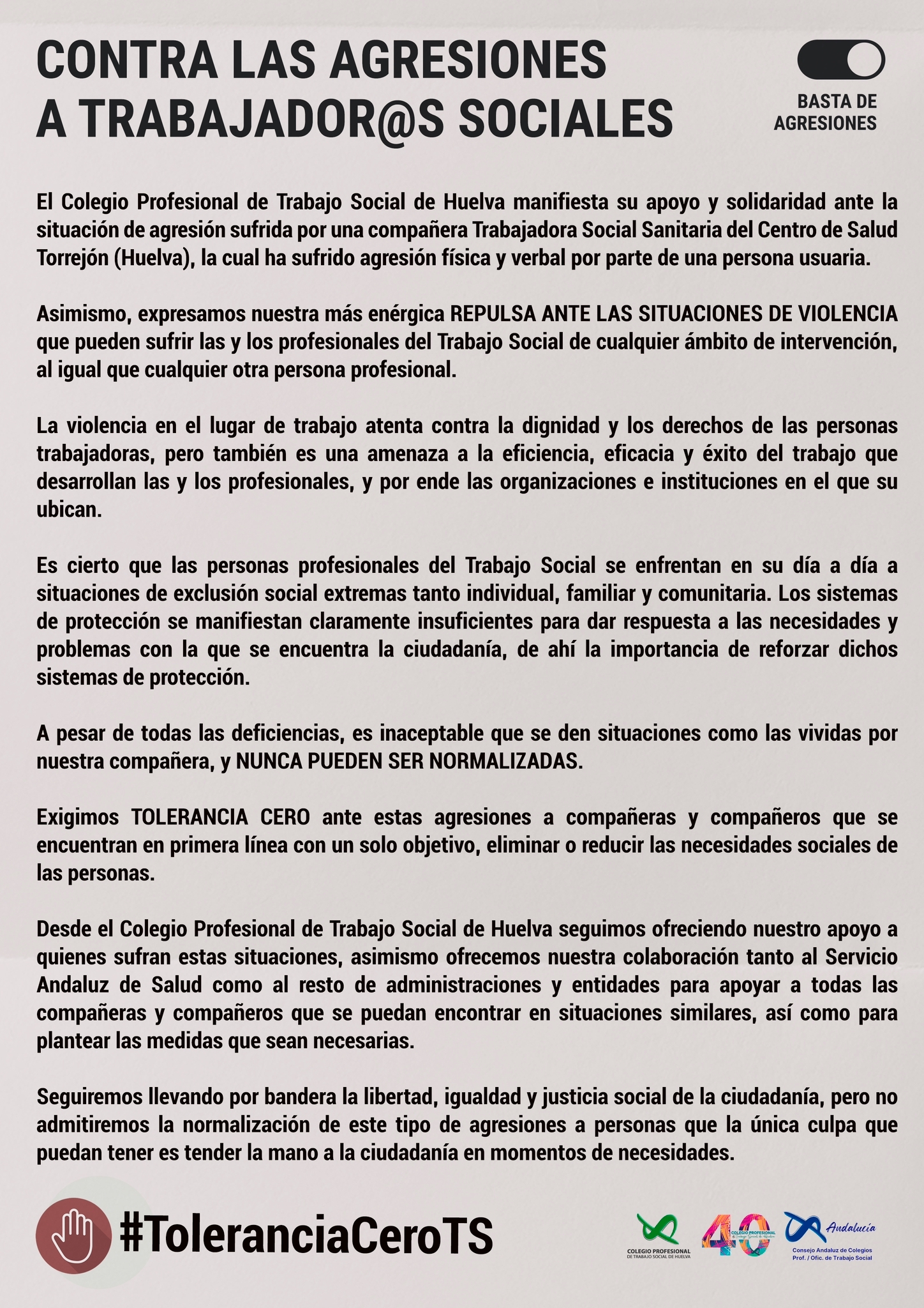 Desde el CPTS Córdoba y ante la situación acaecida ayer de agresión a una compañera Trabajadora Social en su puesto de trabajo por parte de una persona usuaria decimos “BASTA DE AGRESIONES” y le mostramos todo nuestro apoyo y repulsa hacia todo acto violento, adhiriéndonos al comunicado del CPTS Huelva: